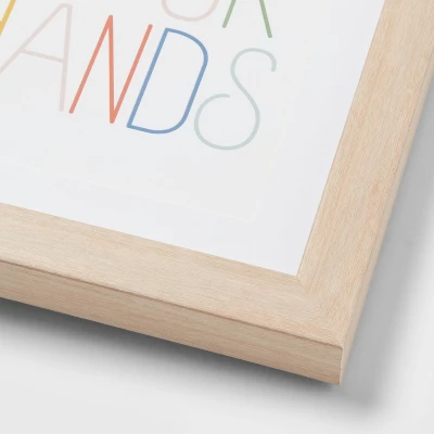Decorate a kid’s room or bathroom with the 2-Pack of Kids’ Framed Wall Arts from Pillowfort™. This pack of two framed wall art pieces includes one with the message “Wash Your Hands” and another with the message “Brush Your Teeth,” written in multicolor letters for an eye-catching look. Designed with a neutral-shade wooden frame, this art comes with a sawtooth back for easy hanging on the wall.