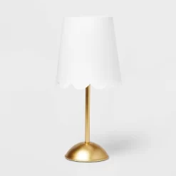 Light up your kid’s space in elegant style with this Accent Lamp from Pillowfort™. This gold-tone lamp features a drum-shaped white shade with scalloped edges and a gold-tone metal body for appealing contrast. Designed with a socket push-through switch, this accent lamp is designed with a one-way light setting for easy on and off.
